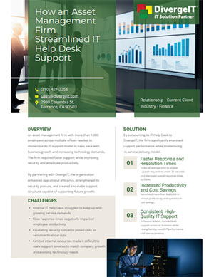 The firm decided to explore outsourcing options and discovered DivergeIT, a specialist in delivering outsourced IT Help Desk services tailored for financial firms. After considering several alternatives, the firm chose DivergeIT due to its expertise in rapid response and robust security measures.